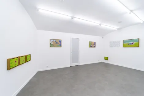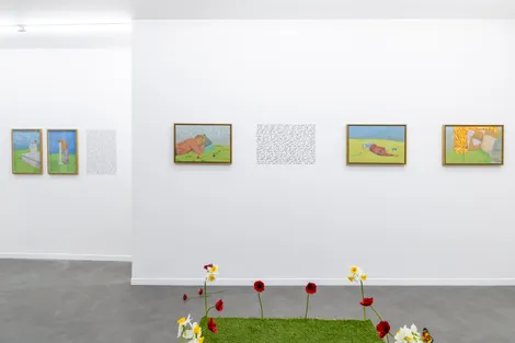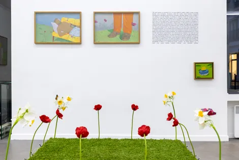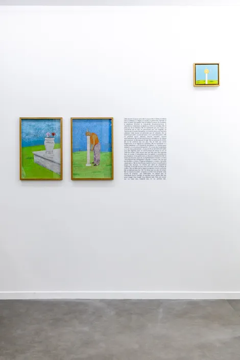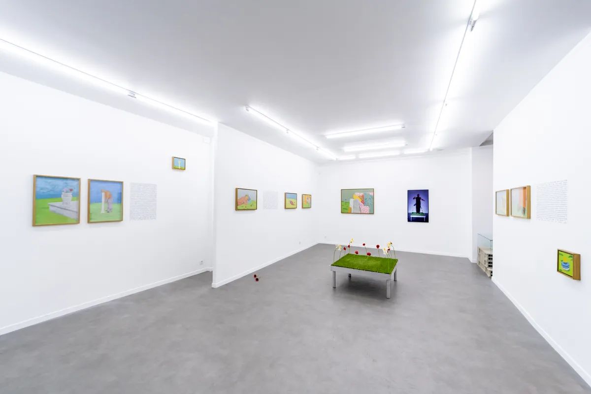 Les fleurs sont un motif récurrent des œuvres de Mahdi Baraghiti. En plastique ou en paillettes ; en peinture, dessin ou photographie ; tantôt fragiles, hésitantes, et cueillies à la volée ; tantôt clinquantes, trompeuses, et installées dans l’urgence d’un départ forcé ; elles rappellent à la mémoire les maisons que sa famille et lui ont dû quitter, et bordent les rêves des prisonniers injustement enfermés. Elles accompagnent parfois les morts dans leur dernière demeure et poussent encore par-dessus eux une fois que le temps a passé. Elles ceignent ici le carré vert installé par le performeur pour danser ; égayent là les horizons déployés par le peintre pour s’échapper. Elles éclatent de leur rouge sanglant dans le vert environnant et fanent bientôt sous des ciels où ne perce nul soleil.